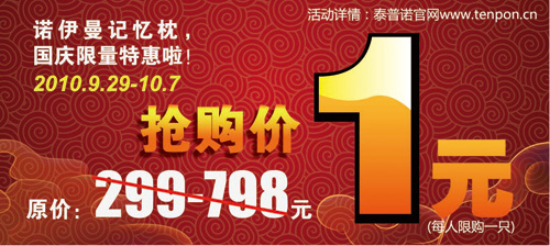 2010-9-29活動內(nèi)容:諾伊曼正品記憶枕,國慶限量特惠啦!原價299-798元,現(xiàn)價僅售1元,每人限購一只!活動價格:1元產(chǎn)品原價:299-798元活動時間:9/29---10/7訂購方式、活動詳情請登錄:泰普諾官網(wǎng)www.tenpon.cn...[繼續(xù)閱讀] -