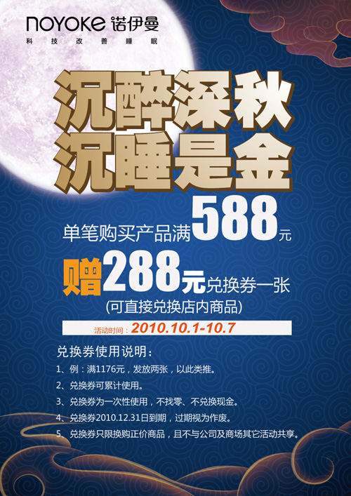2010-9-30購買產(chǎn)品滿588元,贈288元產(chǎn)品兌換券!活動說明:※單張購物小票購正價產(chǎn)品每滿588元,發(fā)放兌換券一張,滿1176元,發(fā)放兩張,以此類推。※產(chǎn)品兌換券可累計使用。※產(chǎn)品兌換券為一次性使用,不找零,不兌換現(xiàn)金。※產(chǎn)品兌換券使用期限:2010.12.31止,逾期即視為作廢。※產(chǎn)品兌換券只限換購正價產(chǎn)品...[繼續(xù)閱讀] -
