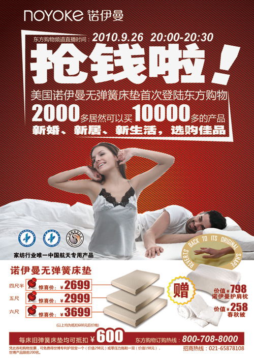2010-11-16床墊新紀元!限時特惠,豪華體驗啦!諾伊曼首創無彈簧床墊,東方CJ限時特惠:豪華床墊四折特惠,再送價值798元護肩枕和258元春秋被!另外,以舊換新,每床舊彈簧床墊可600元。只此一檔,快來搶購吧!直播時間:2010.11.1620:00~20:30活動詳情:www.tenpon.cnwww.noyo...[繼續閱讀] -