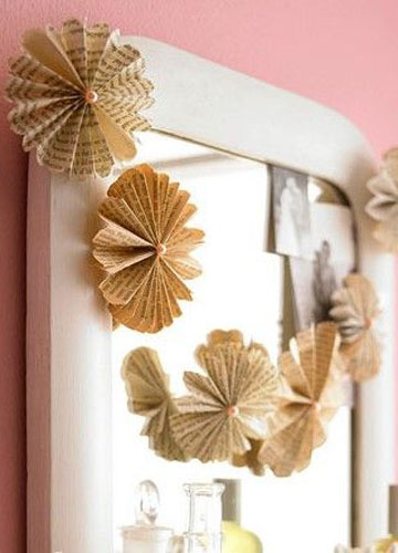 2012-5-9扎朵小花來裝飾純白無色感的家具通常會和空間產生分歧,且相對單調,把沒用的舊書本內頁扎成一朵朵小花,隨意散落于鏡面上,讓原本單薄的家具有了體量,而周圍的其他家飾也讓空間顯得更加動感一些!钪谱鬟^程☆STEP1:將整張書頁完全內外翻折出印痕后再次對折。STEP2:重復完成上個步驟后,將這兩個部件用棉線扎...[繼續閱讀] -