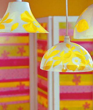 2012-6-20碗狀吊燈,單調的形式太過千篇一律。排列組合在一起不免看起來有些乏味。給吊燈穿上漂亮的花外套。先在即時貼上畫出漂亮的花朵圖形,用剪刀把圖形剪下來,貼在燈罩表面。如果覺得色彩還不夠突出,可在燈具內側噴上白色的自噴漆,那樣更有種朦朧的美感。用顏料在桌旗上勾勒出花朵圖形,再用圓刷筆蘸取顏色細心地暈染。漂亮的...[繼續閱讀] -